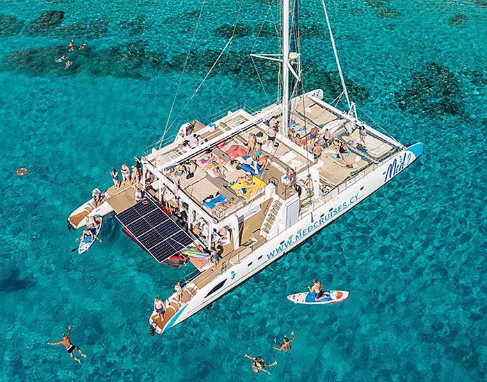 A nap azzal kezdődik, hogy felveszünk a szállodából, majd átszállítunk a katamaránra. Miután a fedélzeten vagy és berendezkedtél, a távolba evezünk Famagusta felé, megkerülve a napsütötte Cape Greco és Protaras partvidékét. Mielőtt elérnénk a Konnos-öblöt, a kapitány lehorgonyoz, hogy lehűlhess a hívogató vízben, és élvezhesd az ingyenesen kínált vízi játékokat, felkészülve a még több napozásra.