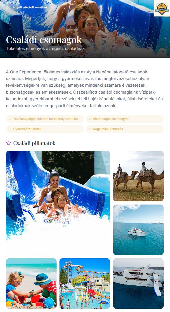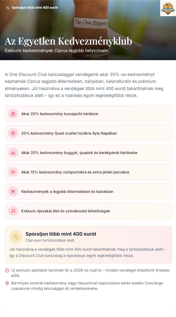 A One Experience gondosan megtervezett felnőtt és családi csomagokat kínál, amelyek lefedik a tökéletes ciprusi nyaralás kihagyhatatlan élményeit, a VIP strand- és medencekluboktól kezdve a hajó- és jachtkirándulásokig.